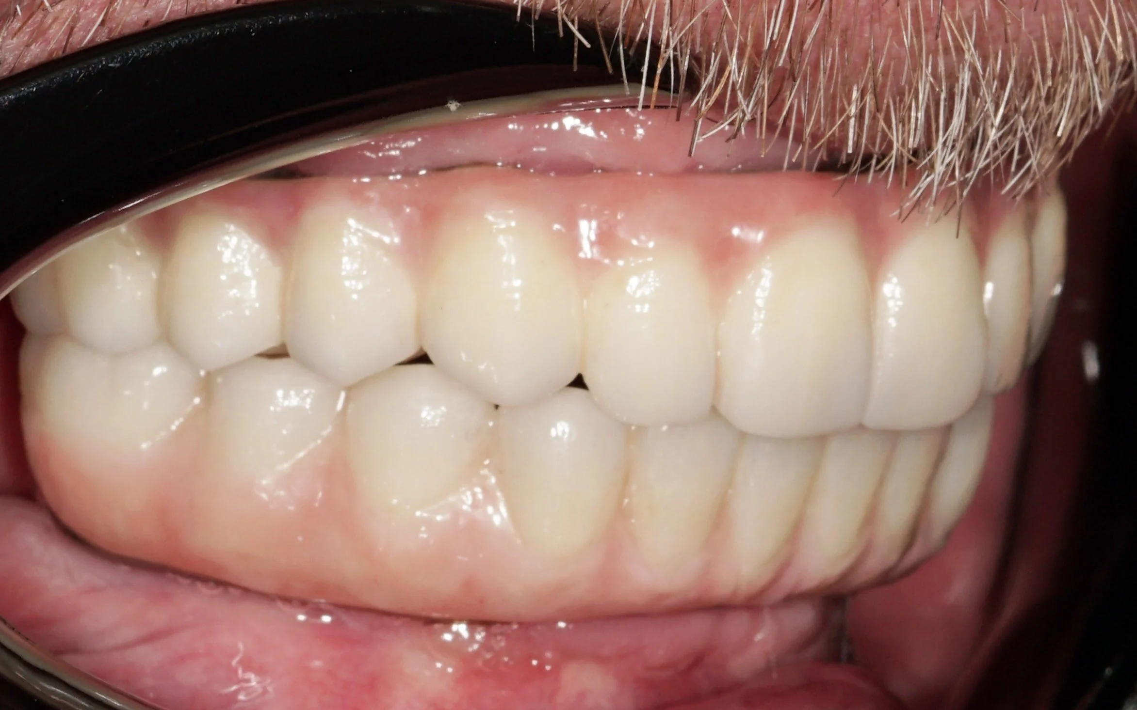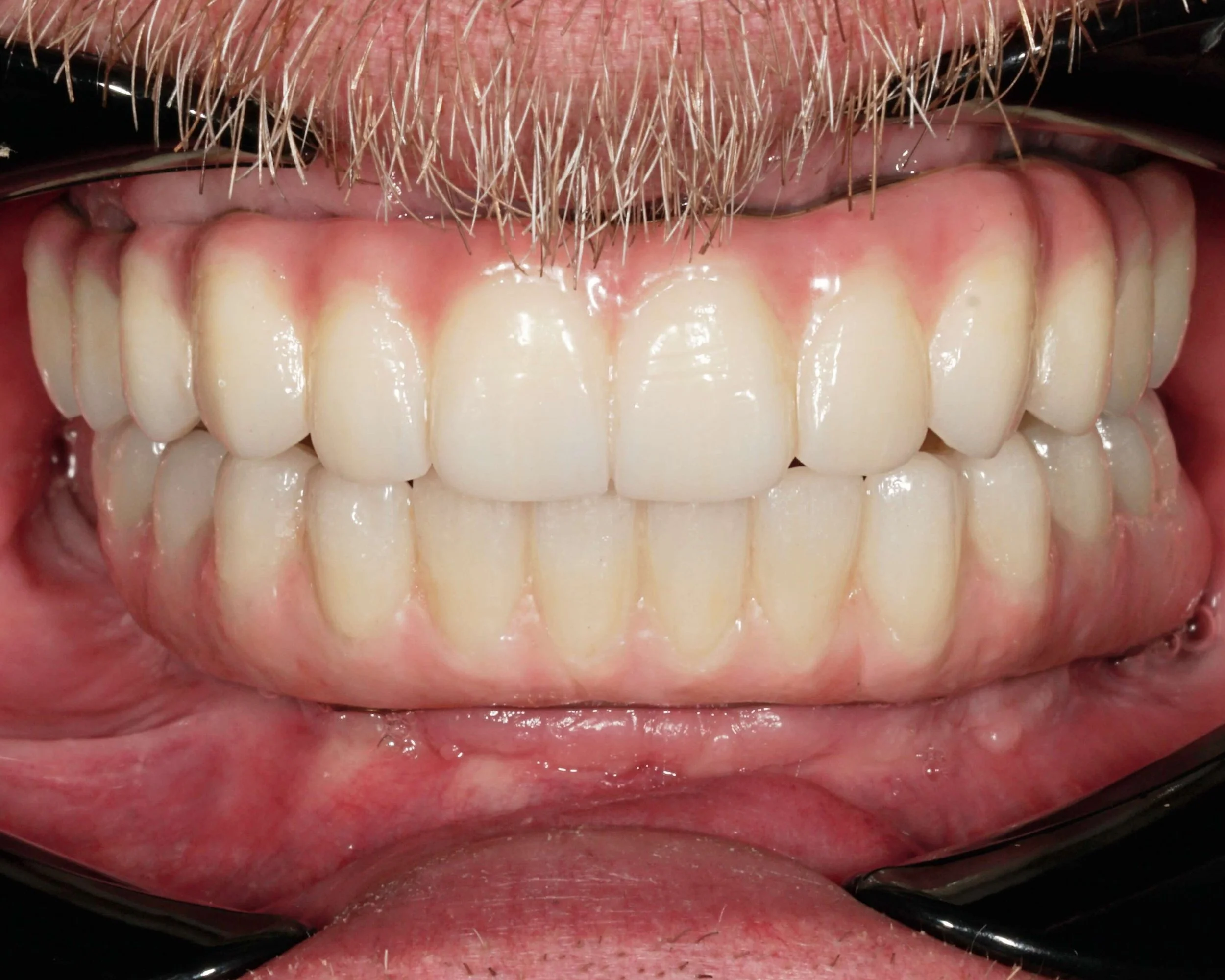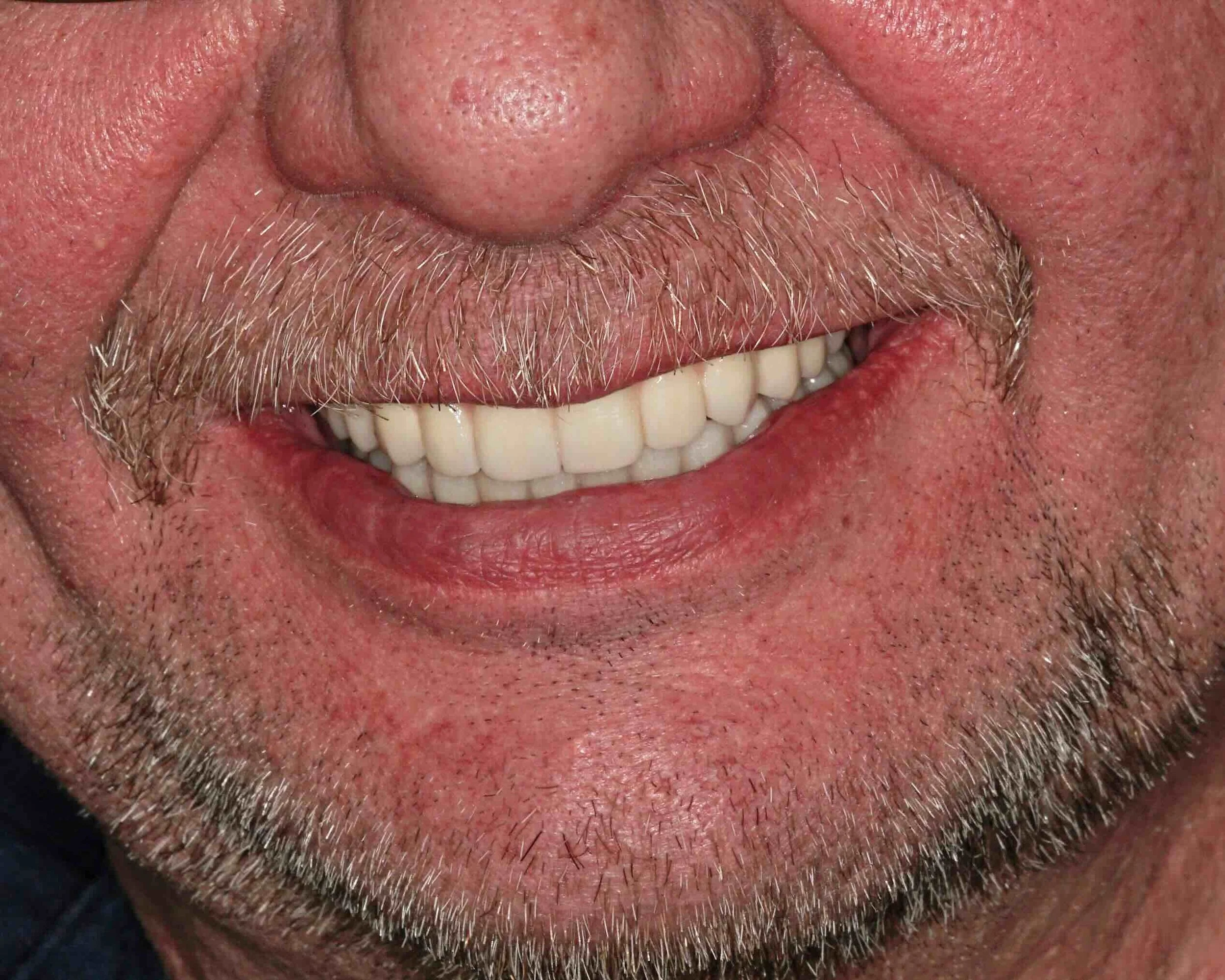 After complete osseointegration, final zirconia prostheses were delivered. The patient opted for a slightly darker, more natural shade to mimic his original dentition while maintaining symmetry and facial balance.