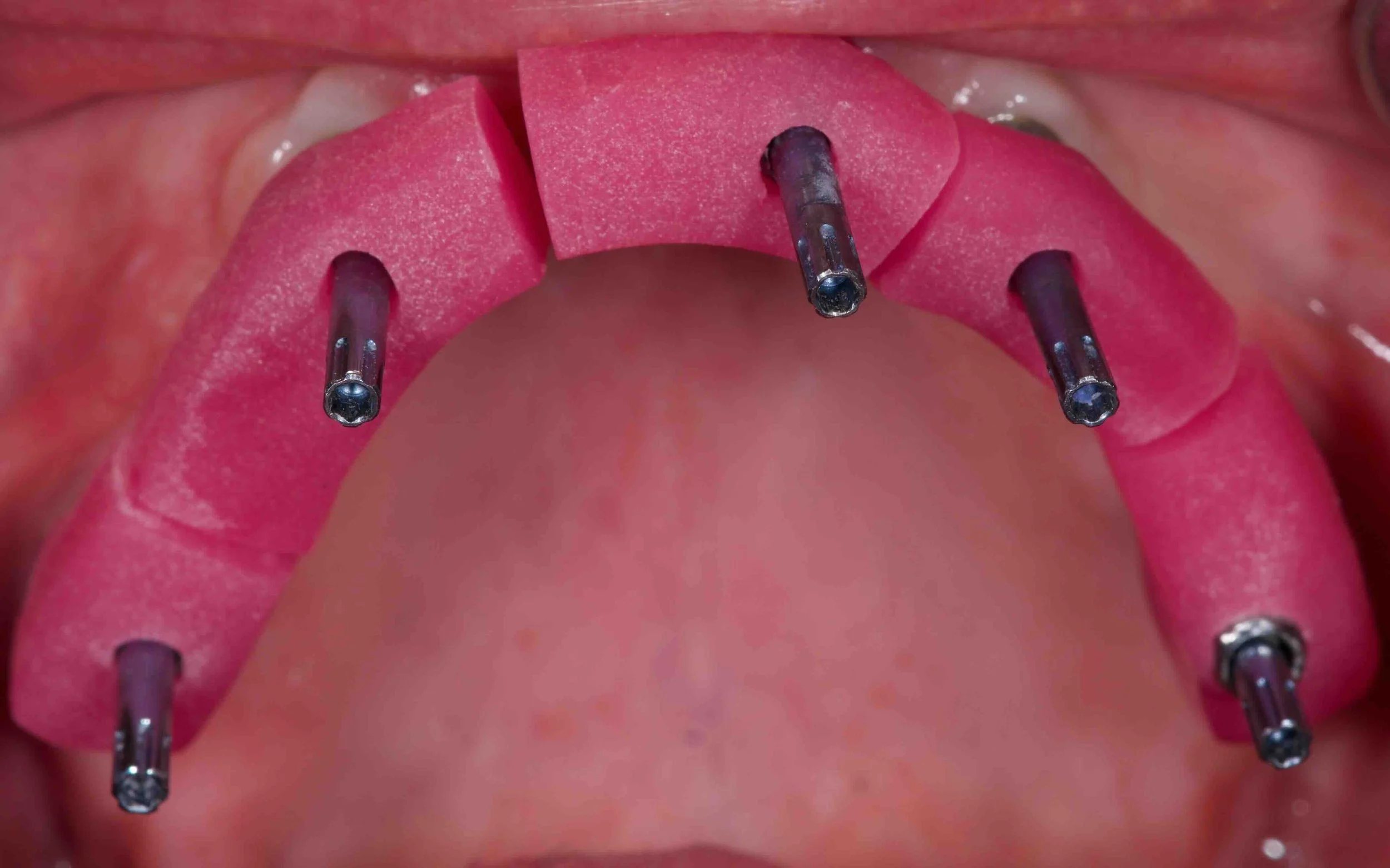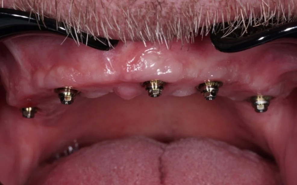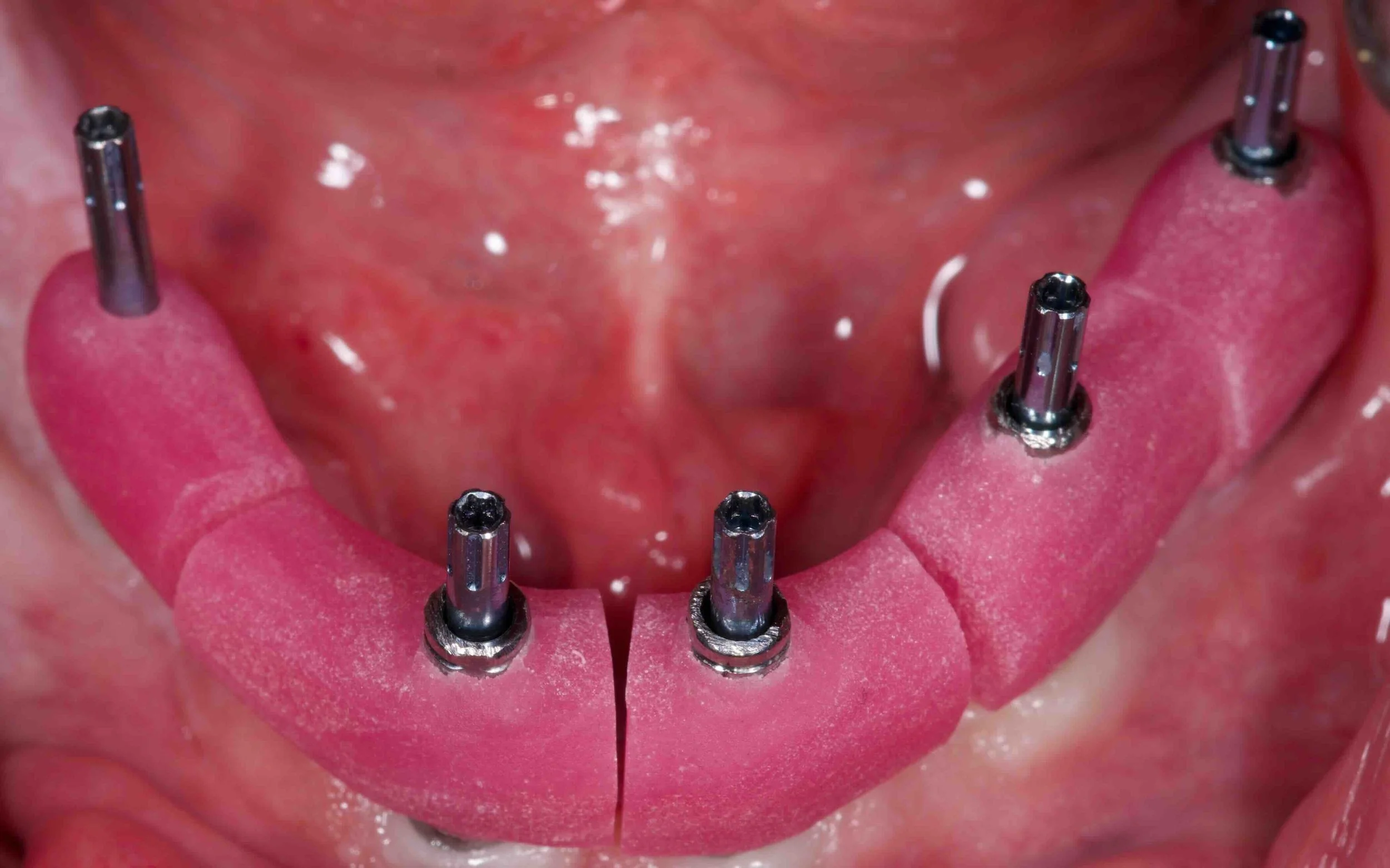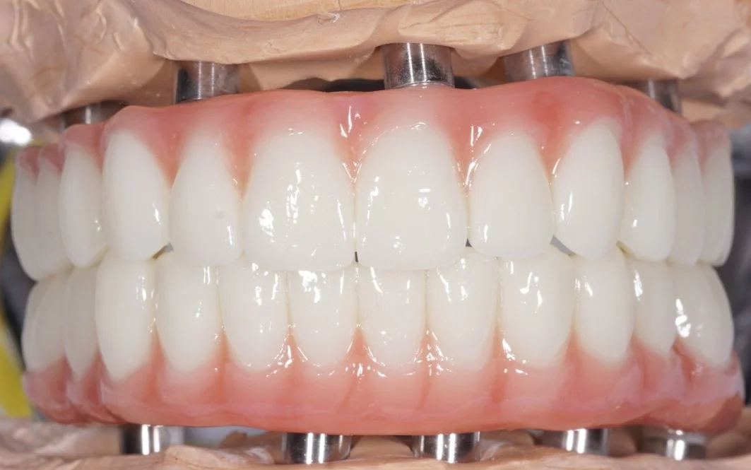 All on 5 denture. The screws indicate where implants are positioned for the best load distribution, a consept called as anterior-posterior spread.
