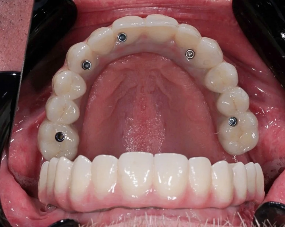 Following atraumatic extractions and alveoloplasty, five implants were placed in each arch and restored with fixed provisional bridges. The final monolithic zirconia prostheses were designed digitally and customized to closely match the patient’s preferred natural tooth shade.