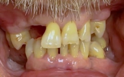 Significant wear, misalignment, and advanced periodontal loss were present, affecting both function and esthetics.