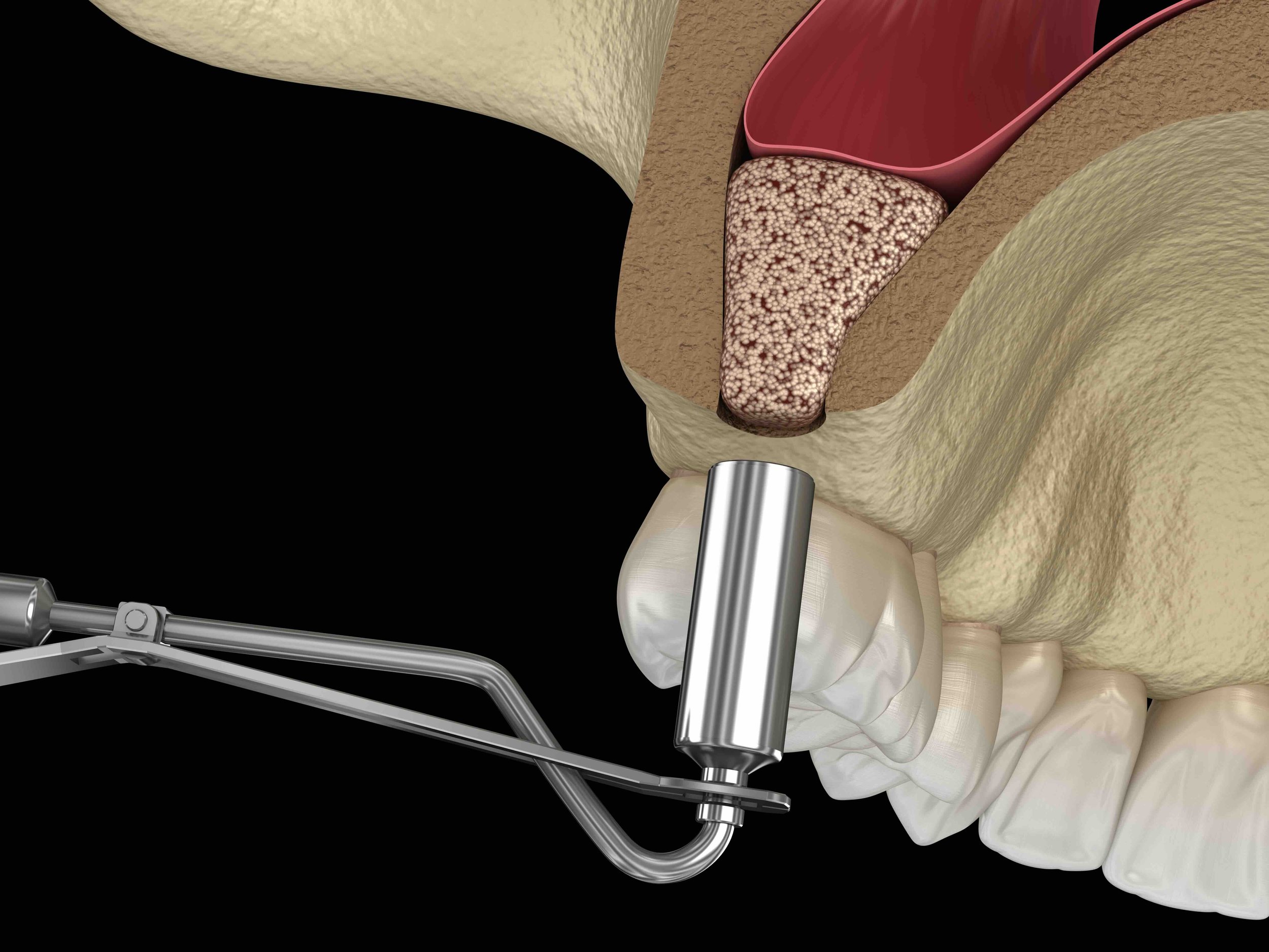 The sinus membrane is gently lifted, and bone graft material is placed beneath it.